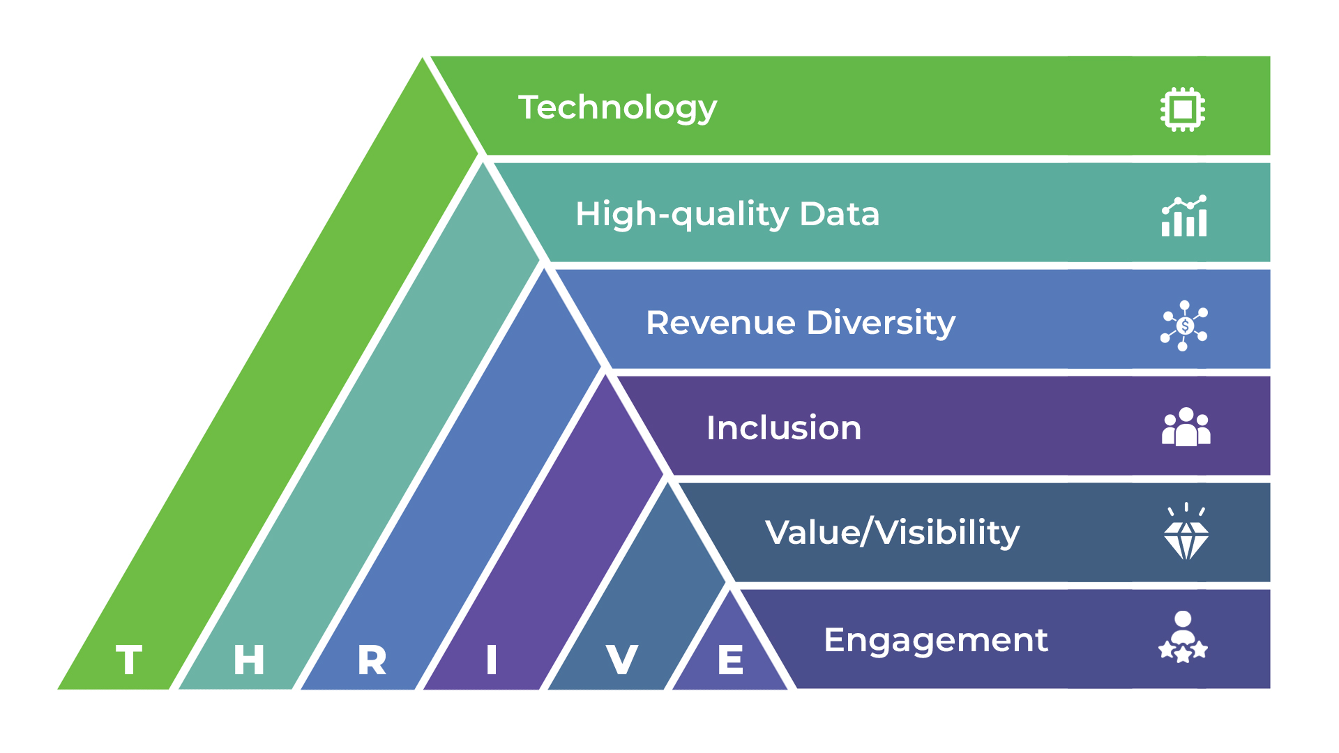 The Continuous THRIVE model is a strategic framework designed to help businesses, organizations, and associations achieve sustainable growth. It focuses on integrating multidisciplinary competencies and tracking key performance indicators (KPIs) to ensure steady, long-term success. The model emphasizes technology, data, revenue diversification, inclusion, value creation, and engagement as critical drivers of growth.